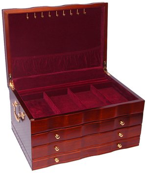 Shop for Jewelry Storage from JewelryBoxes.com! If you're ready to set eyes on some fantastic curves it's time you checked out the Ava Mahogany Jewelry Box. Crafted of solid wood and finished in light mahogany this jewelry box has a gracefully curved front for an added feminine touch. Brass hardware elegantly offsets the wood and each of the four levels of this box is lined in red velvet. Compartments of various sizes occupy each drawer so you're sure to find a spot for everything