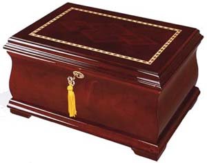 - High Lacquer Mahogany Finish with Ivory Velvet Lined Interior